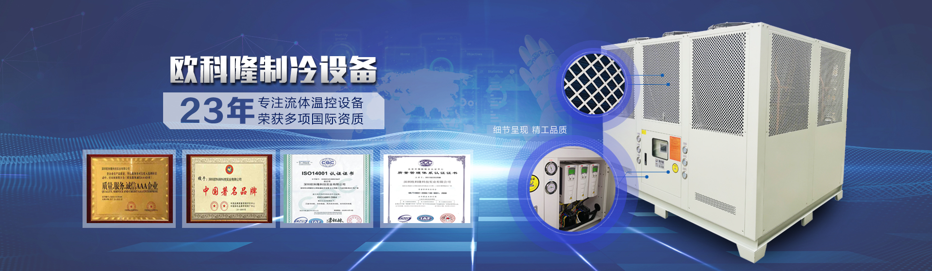 深圳歐科隆科技實業有限公司源自歐洲先進制冷技術和科學管理模式,承襲歐洲人嚴謹務實、精益求精的工作作風。1963年在洛杉磯成立,1999年在香港設立分部正式進軍亞洲市場,后經改革開放招商引資以及日益發展需求于2006年在深圳成立:深圳歐科隆科技實業有限公司。半個多世紀以來歷經風雨不忘初心、百舸爭流為夢前行一直專注于:工業制冷設備的研發、生產制造銷售、服務。經營范圍包括:冷水機、螺桿式冷水機組、工業冷水機、水冷式冷水機、風冷式冷水機組、冷凍機、注塑專用冷水機、電鍍冷水機、混泥土專用冷水機箱式冷水機、低溫型冷水機、耐酸堿冷水機、激光冷水機、中央空調柜機、電鍍冷水機、化工冷水機、混凝土冷水機、工業冷凍機、冰水機、非標冷水機、冷卻水塔、模溫機、粉碎機、拌料機等設備及輔助設備。...更多詳情